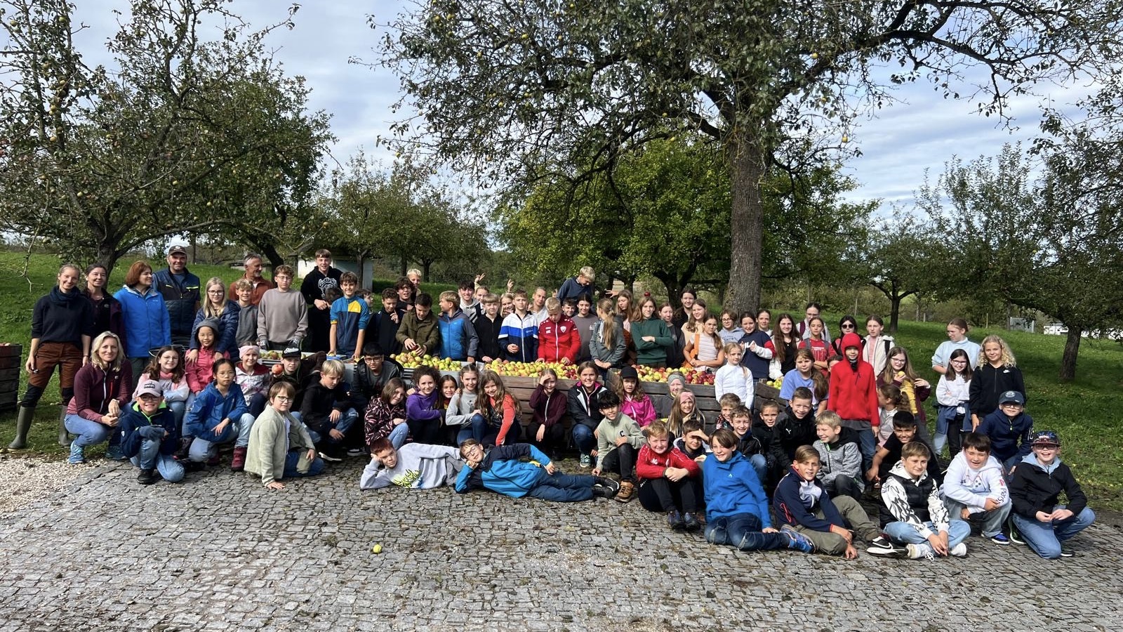 Obstgenbank Ritzlhof am 27.9.2024: Rund 100 Schüler und Schülerinnen des BRG Enns haben in drei Stunden 4000 kg Äpfel gesammelt. Daraus wurden 2500 Liter Schulsaft gepresst.